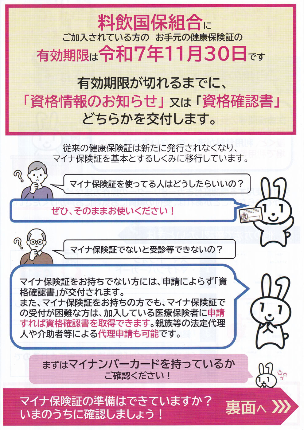 上京料飲組合では、11月1日から順次新しい保険証(資格情報のお知らせまたは資格確認書)を簡易書留郵便にて
